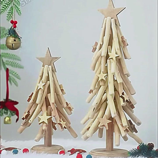 Small wooden Christmas tree with artistic and fresh decoration for beautiful homes